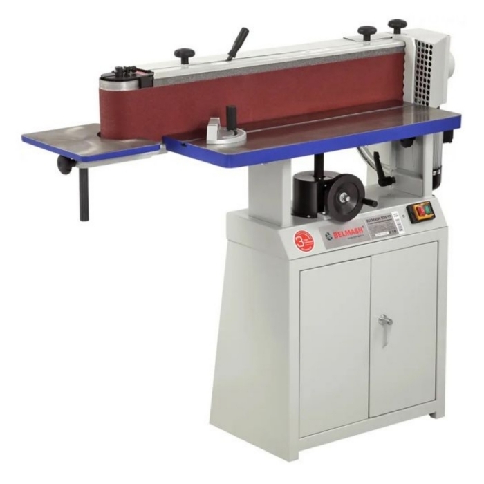 В движение ленту приводит однофазный асинхронный двигатель мощностью 2200 Вт. Ее скорость движения 16 м/с. Механизм осцилляции улучшает качество процесса шлифования. Амплитуда колебаний -12,5 мм. Поэтому при ширине ленты 152 мм максимальная высота обработки составляет 160 мм. Рабочие столы выполнены из чугуна и прошли фрезерное шлифование, имеют регулировку по высоте. В паз основного рабочего стола можно установить параллельную направляющую или угловой упор. Поэтому можно обрабатывать не только канты, но и пласть. Назначение малого стола - шлифование заготовок с внутренним радиусом закругления до 55 мм.
