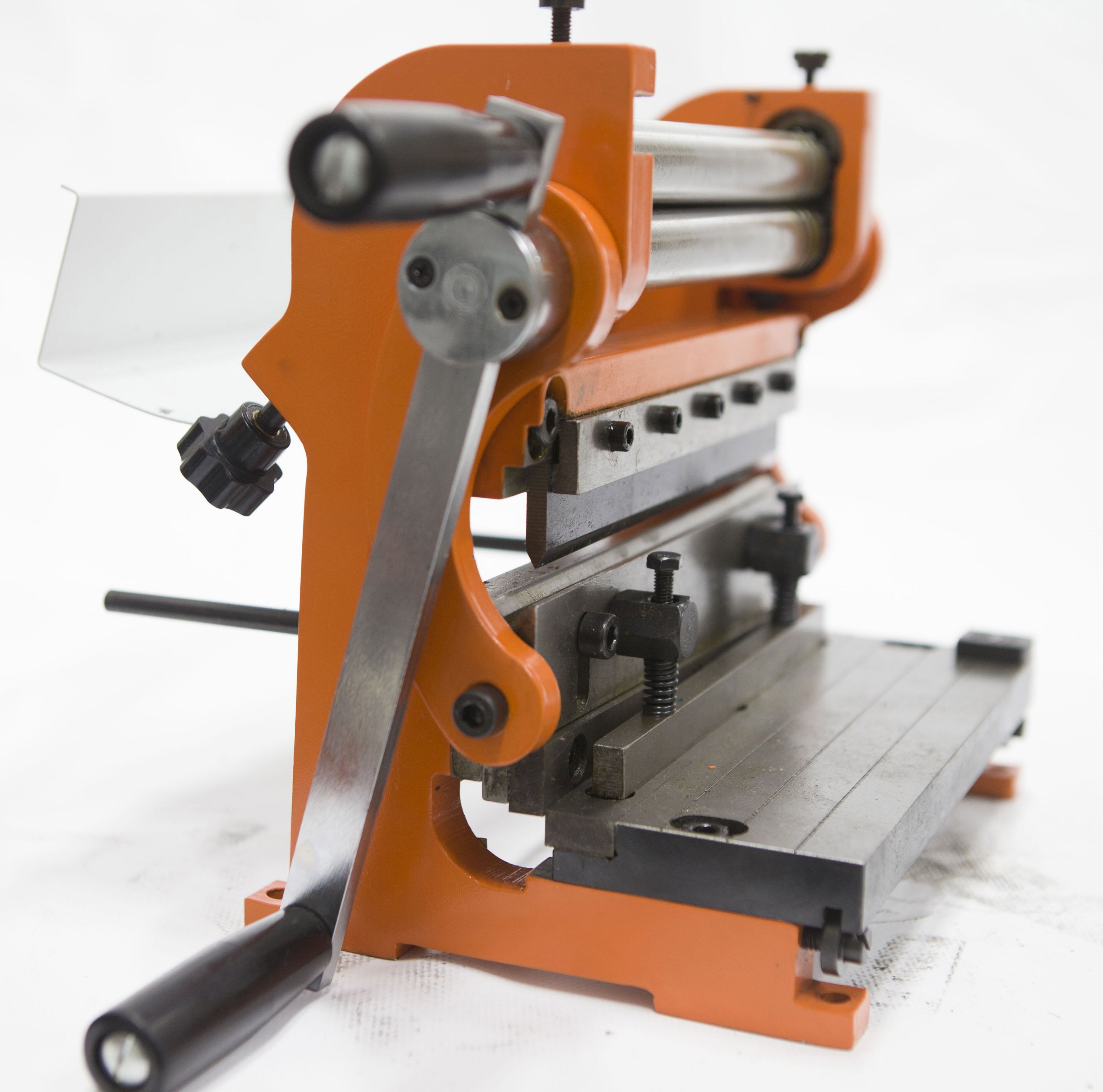 Идеальная комбинация для обработки листового металла толщиной до 1,0 мм. Вальцы имеют трёхваловую конструкцию, верхний вал консольно отводится в сторону для быстрого съёма обечайки. Точно полированные вальцы из углеродистой стали. На вальцах станка расположены желоба для гибки арматуры. На станке установлен откидной защитный кожух для предотвращения попадания в вальцы посторонних предметов во время выполнения другой операции. Гибка на максимальный угол 90°. Гибка происходит по типу гибки на прессе – гибочными штампами (пуансон х матрица). Съемные сегменты пуансона позволяют производить отбортовку поддонов и коробов. Гильотина станка идеально режет металл до 1.0 мм. Задняя часть станка имеет ограничитель подачи листа, для резки листа на заданный размер. Для снижения усилия оператора во время работы станок оснащен удобными рукоятями большой длины с противоскользящими наконечниками. Возможность работы с правой и левой стороны станка (ручка вращения перестанавливается по желанию).