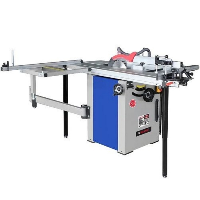 Станок оснащен основным чугунным столом, двумя дополнительными секциями из листовой стали, подвижным столом из алюминиевого профиля и столом поперечного реза из стального профиля. Основной и подвижный столы имеют по одному стандартному пазу для установки угловых упоров или дополнительных приспособлений. На передней направляющей параллельного упора есть шкала для точной установки.