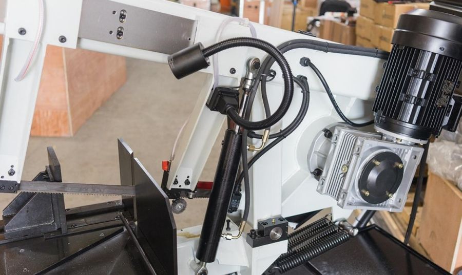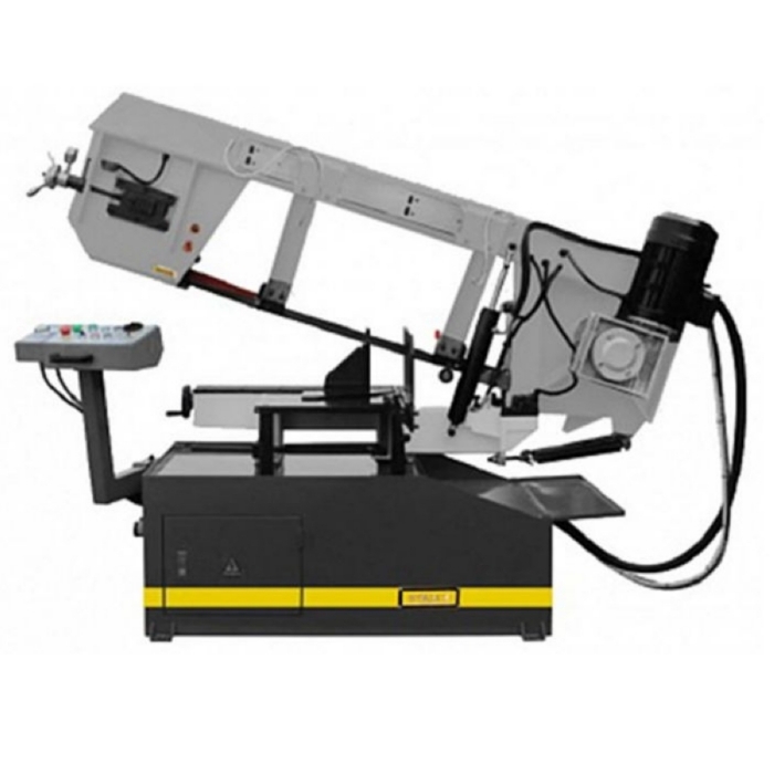 В рабочей зоне резания полотно точно ведется двумя направляющими головками с твёрдосплавными пластинами. Станок имеет неподвижные тиски и поворотный механизм рамы, для пиления под углом необходимо изменить положение рамы относительно неподвижных тисков. Высота полотна 34мм позволяет пилить c высокой точностью и параллельностью полые и профильные заготовки под различными углами.