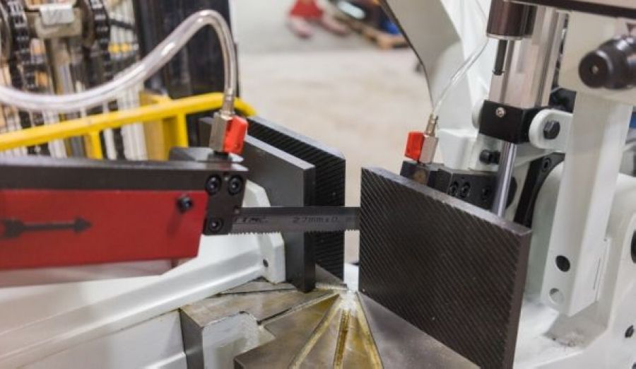 Модель имеет быстрорегулируемые тиски для резки под углом, поворачивается рама, а не заготовка. Тиски с системой быстрого отвода ускоряют процесс смены заготовки (ускоренный отвод подвижной губки происходит без вращения маховика). Зажим заготовки осуществляется тисками вручную, подача заготовки - также вручную. Наличие системы СОЖ в стандартной комплектации – позволяет добиться высокой производительности.