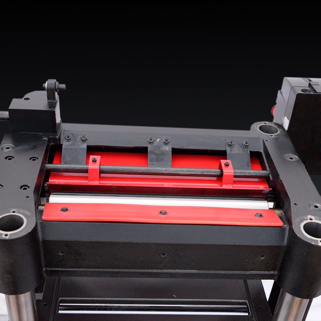 - Зубчатый стальной подающий ролик и полиуретановый выводной ролик обеспечивают плавное и эффективное перемещение заготовки.