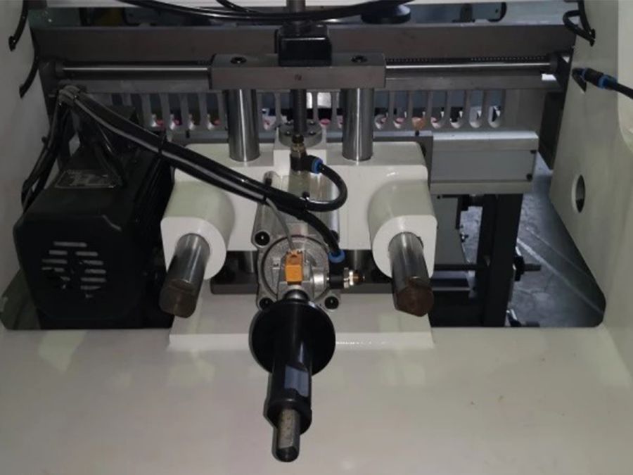 - Базирование детали - четыре пневматических упора надежно закреплены на массивной направляющей линейке. Упоры имеют возможность перемещения и позволяют легко настроить станок на обработку заготовок.
