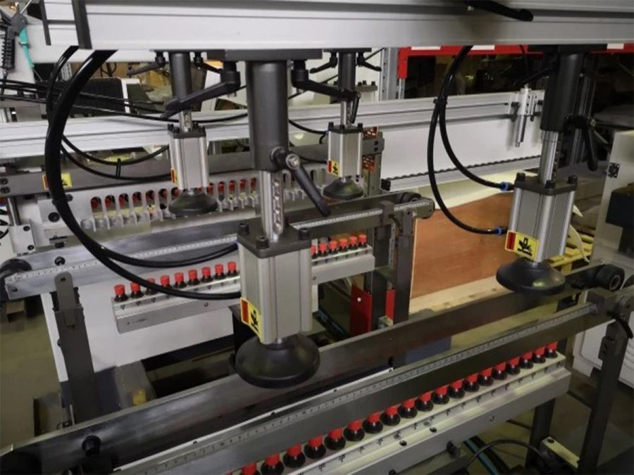 - Система фиксации заготовки - это пневмоприжимы, настраивающиеся на толщину заготовки, а также имеющие возможность базирования в любом месте рабочей зоны станка обеспечивают точную и надежную фиксацию заготовок.