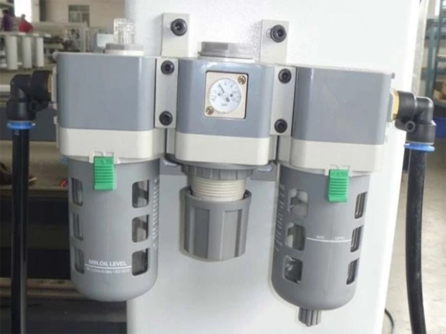 - Узел подготовки сжатого воздуха, обеспечивает дополнительное исключение влаги, примесей грязи из воздуха, а так же позволяет осуществлять регулировку давления сжатого воздуха и его контроль на входе в пневмосистему. Так же имеется лубрикатор который автоматически с подачей воздуха смазывает штоки пневмоцилиндров, и др. внутренние элементы пневматики.