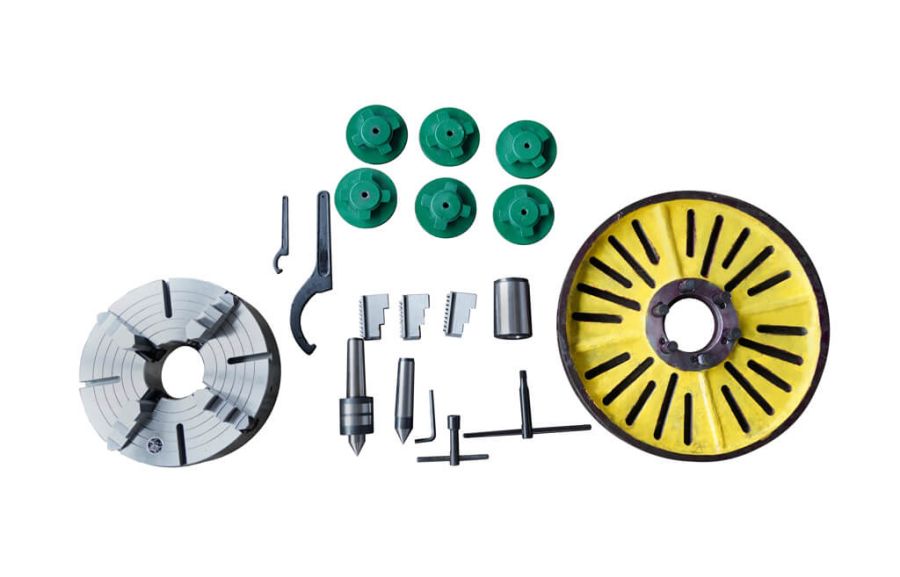 - В ЗИП входят 4-кулачковый патрон, обратные каленые кулачки, вращающийся и не вращающийся упорные центра, конус-переходник, планшайба, набор ключей, опоры и руководство по эксплуатации на русском языке.