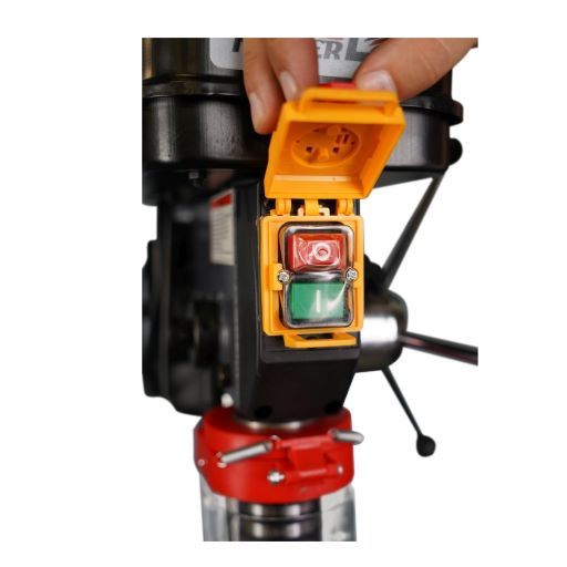 На лицевой стороне сверлильной головы расположены кнопки включения и выключения станка с крышкой, которая также используется как аварийный выключатель.