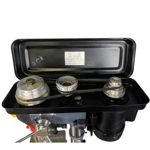 · Скорость вращения шпинделя регулируется с помощью перекидывания ремней в блоке ременных шкивов. Схема расположения ремней с диапазоном оборотов расположена под защитной крышкой кожуха.