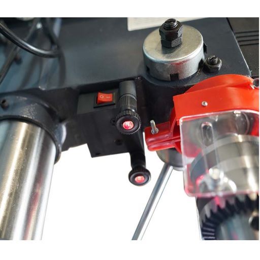 · На лицевой стороне сверлильной головы расположены кнопки включения и выключения станка с крышкой, которая также используется как аварийный выключатель.