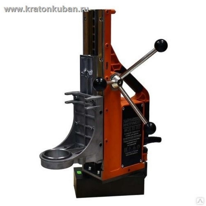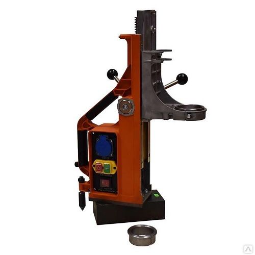 Облегчает работу на высоте, сверление больших отверстий, в том числе коронкой, в вертикальных стенках и над головой. Для безопасности работы, питание на розетку, встроенную в станину, поступает только после активации электромагнита. На случай прерывания подачи электричества, стойка должна быть закреплена страховочным ремнём (входит в комплект поставки).