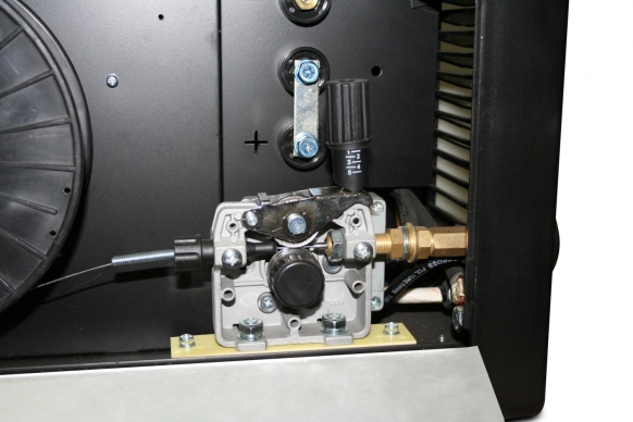При смене полярности, то есть при подключении горелки к отрицательному контакту, доступна сварка МИГ/МАГ порошковой проволокой. Данный режим позволяет выполнять сварочный процесс без защитного газа, так как порошковая проволока имеет специальный состав, который при расплавлении создает защитную оболочку и флюс для защиты сварочной ванны.