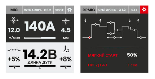 Интуитивно понятная циклограмма сварочного режима позволяет профессиональному сварщику с легкостью настраивать почти 2 десятка параметров специальных режимов: Режима работы горелки настраивается в стандартных режимах 2Т и 4Т, в специальных режимах S2T, S4T, а также в редких режимах: