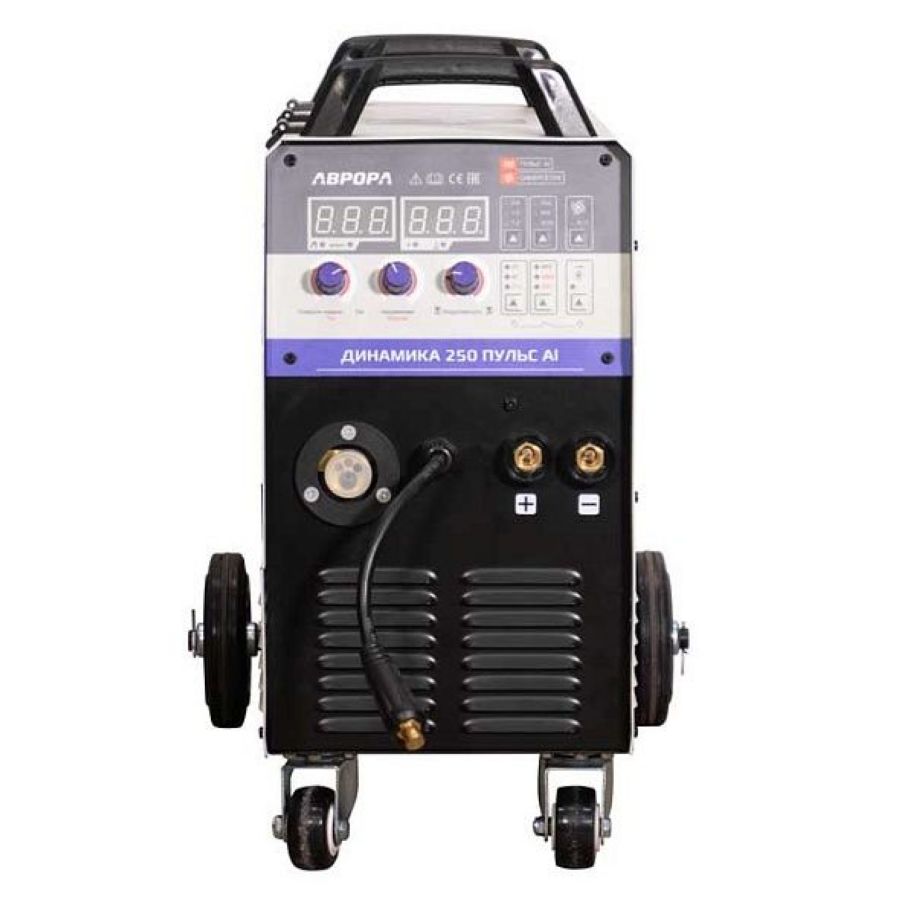Инверторный сварочный полуавтомат АВРОРА Динамика 250 ПУЛЬС Al – это «Умный» инвертор с полностью цифровым управлением на базе ARM платформы 32бит 72МГц. Однофазный источник сварочного тока предназначен для полуавтоматической MIG-MAG сварки, для ручной дуговой сварки штучным электродом MMA, а также для аргонодуговой сварки в режиме LIFT TIG DC. Аппарат выполнен в едином корпусе со встроенным подающим механизмом, рассчитанным для использования катушек D200 и D300 (5-20кг). Тележка с подставкой под баллон и высокая компоновка аппарата существенно облегчают работу сварщика. Аппарат ориентирован на грузовые и легковые автосервисы, небольшие производства и мастерские, которым приходится решать сложные сварочные задачи, в условиях ограничений возможностей подключения только к однофазным сетям питания. Важной особенностью аппарата можно назвать высокую производительность Динамики 250 ПУЛЬС Al. Ток длительной нагрузки источника при +40С составляет 180А. Это значит, что при данной температуре и значении рабочего тока аппарат не перегреется и не уйдёт в защиту даже при длительной непрерывной работе. Динамика 250 ПУЛЬС Al может быть настроена сварщиком для работы в ручном или синергетическом режиме управления. Честные характеристики аппаратов АВРОРА помогут справиться с любой сварочной задачей. Импульсный режим полуавтоматической сварки ориентирован на работу с алюминием. Динамика отлично справляется с удалением оксидной плёнки с поверхности металла и обеспечивает равномерное расплавление кромок свариваемых деталей вдоль всего шва. Технические особенности: Возможность настройки дополнительных параметров сварки 2T, 4T, S4T Комплектация: