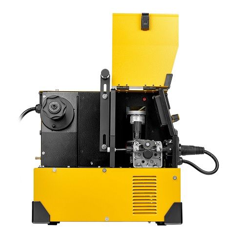- Металлический механизм подачи проволоки. Используется сварочная проволока диаметром от 0,6 до 1,0 мм. Можно установить катушку с проволокой весом до 18 кг (D300) и регулировать скорость подачи проволоки от 2,5 до 13 м/мин.