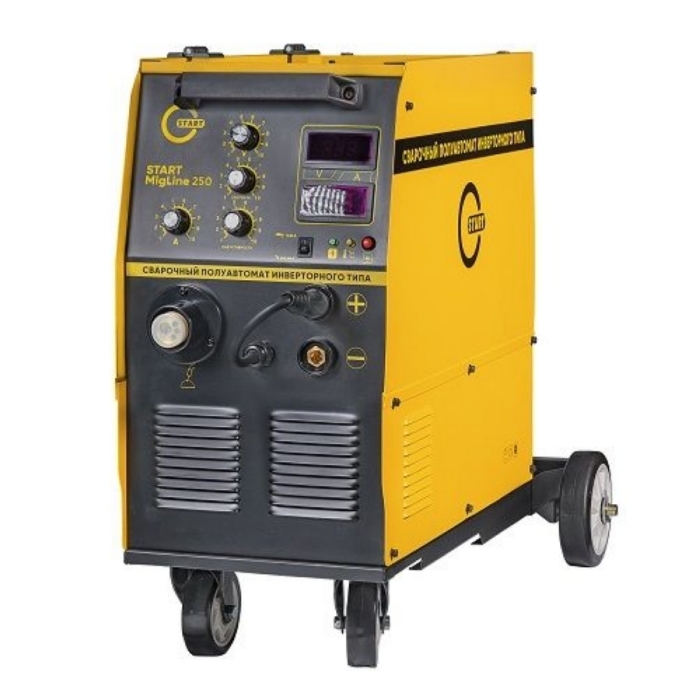 Сварочный полуавтомат Start MigLine 250 - мощный и надежный, выполнен в специальном корпусе на передвижной тележке с возможностью легкой транспортировки данного аппарата, предназначенный для полуавтоматической сварки в среде защитных газов (MIG/MAG) и ручной дуговой сварки MMA.