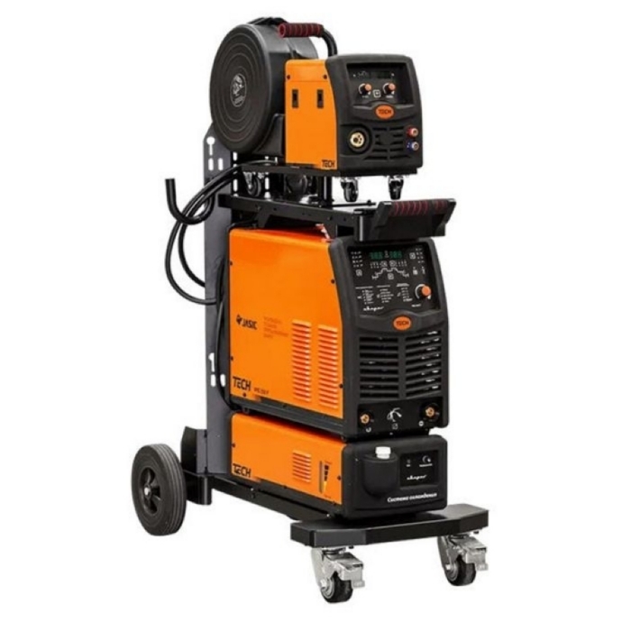 - Блочная система на прочной тележке: источник сварочного тока, подающее устройство и теплообменник;