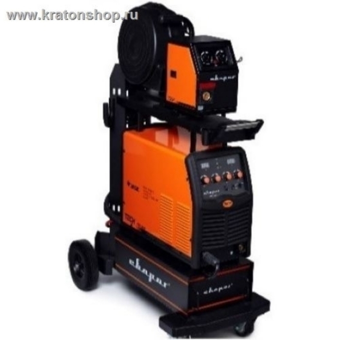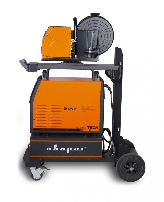 Вольтамперная характеристика инвертора TECH MIG 3500 (N222) и модифицированная система вентиляции позволяет производить длительную и качественную сварку. В данной модели имеются выходы для протока охлаждающей жидкости. Источник устанавливается на стальную тележку вместе с подающим устройством. Также на тележку можно разместить баллоны с газом.
