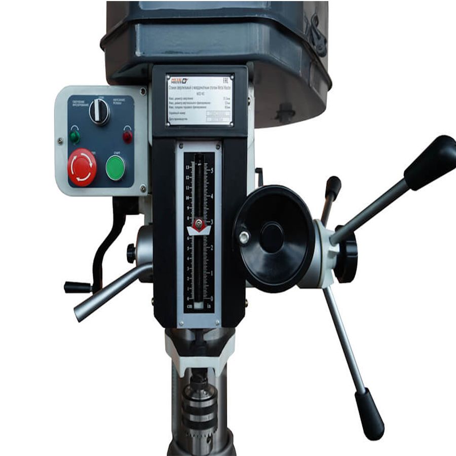 - С правой стороны сверлильной головы расположена трехлучевая рукоятка опускания пиноли с нониусом.