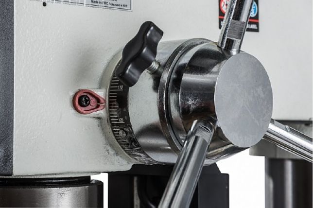 Шпиндель станка имеет конус МК-4, благодаря этому, ну и конечно двигателю мощностью 0,85кВт, станок способен сверлить отверстия в заготовках диаметром 32 мм. Не забывайте, что при этом на станке установлен асинхронный двигатель, подключается он к сети 380В и весь момент от двигателя передается через шкивы и ремни. Всего на станке 12 скоростей от 70 до 1650 об/мин. Обратите внимание именно 70 оборотов, это самая маленькая скорость в классе. Момент огромный и на маленьких оборотах сверлить, например, чугун можно до 35 мм.
