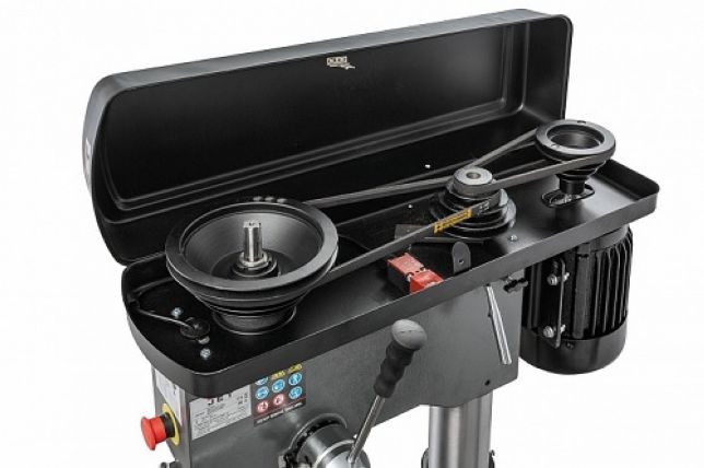 Вращающий момент с двигателя на вал шпинделя передается с помощью клинового ремня через шкивную группу. Диапазон частоты вращения шпинделя осуществляется в пределах от 150 до 2850 об/мин и имеет 12 скоростей. Ход пиноли шпинделя составляет 120 мм. Для контроля глубины сверления предусмотрена шкала с миллиметровой и дюймовой разметкой, а также регулируемый ограничитель.