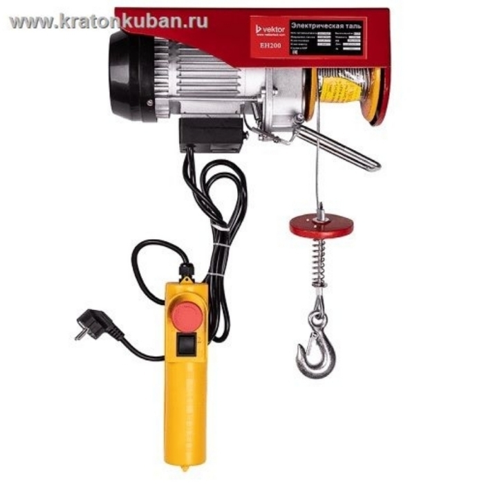 Таль электрическая Vektor EH-200 мощностью 510 Вт используется для подъёма и горизонтального перемещения груза. Механизм подъёма приводится в движение с помощью электродвигателя 220В. Контроль работы осуществляется с помощью дистанционного пульта управления. Максимальная грузоподъемность составляет 200 кг. Горизонтальное движение тали происходит путём ее перемещения по двухтавровой балке на подвесной электрической тележке. Двигатель тали не оснащён системой автоматической остановки в случае перегрузки, поэтому при возникновении подобной ситуации необходимо отключить таль от сети и дать двигателю охладиться.