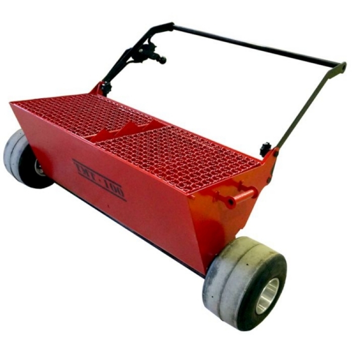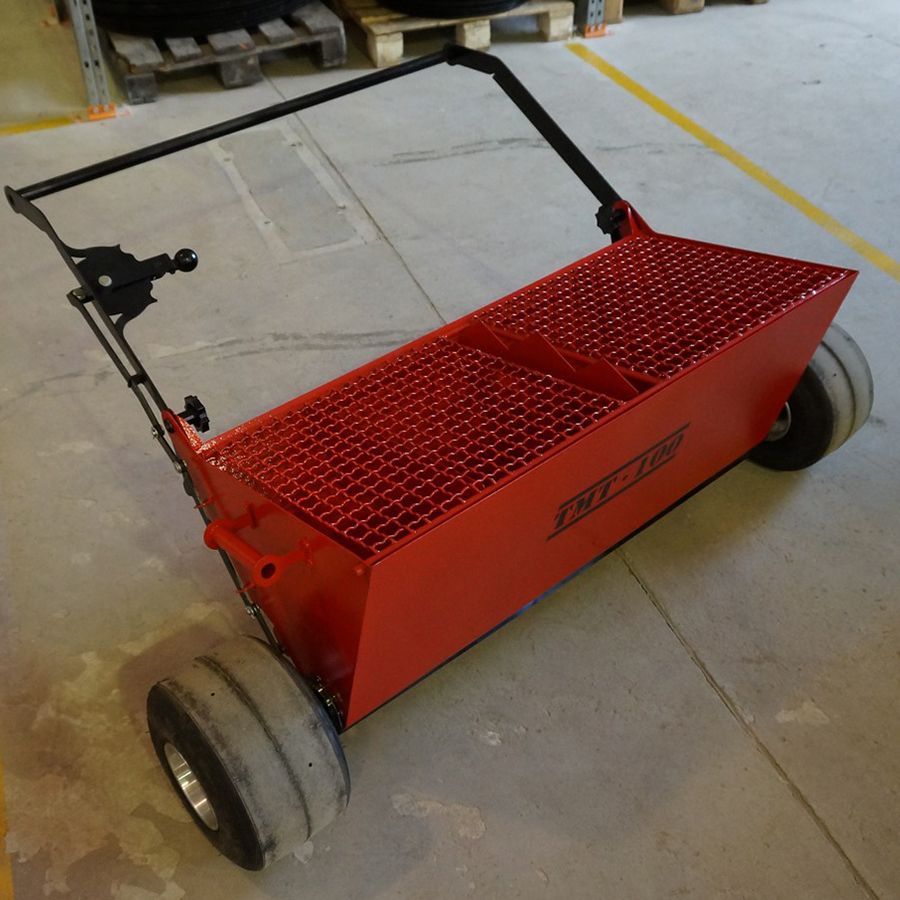 Тележка ТМТ-100 используется для нанесения топпинга на поверхность бетонного пола. Оборудована бункером, вмещающим до 100 кг смеси. На рукоятке предусмотрен регулировочный механизм с фиксированными положениями, который позволяет настраивать расход топпинга. Устройство оснащается двумя независимыми пневматическими колесами шириной 185 мм. Отличается удобством в эксплуатации, управляется одним человеком.