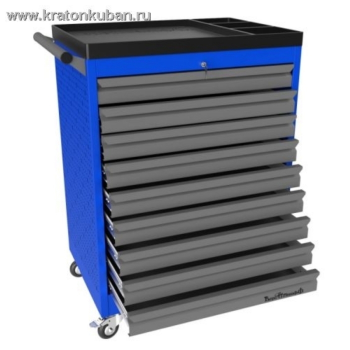 Тележка PROFFI 950.9 для использования на предприятиях занятых ремонтом и изготовлением различной продукции. На боковые стенки инструментальной тележки нанесена перфорация размером 25х25 мм и диаметром отверстия 8 мм, что позволяет устанавливать на них навесной инструмент или крючки. Наиболее популярны тележки инструментальные в сфере авторемонта и обслуживания автомобилей. Тележки имеют выдвижные ящики на шариковых телескопических направляющих полного выдвижения с фиксацией в закрытом положении, предотвращающее открывание при передвижении тележки. Ящики имеют центральный замок, который позволяет ограничить доступ посторонних лиц к содержимому ящиков. Тележка инструментальная изготовлена из высококачественного металла ведущих Российских производителей, покрашена порошковой краской производства Германии, имеет итальянскую и турецкую фурнитуру. Тележки для инструмента оснащены двумя не поворотными колесами диаметром 100 мм, одним поворотным и одним поворотным со стопором, которое фиксирует тележку и предотвращает непроизвольное скатывание.