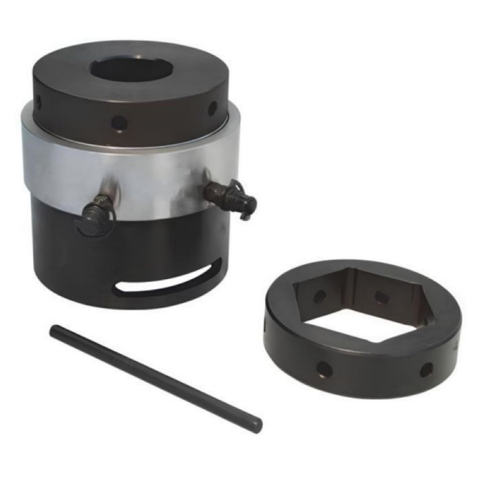 Тензорные домкраты MBT-6 однопоршневые с механическим возвратом - предназначен натяжения резьбовых шпилек при закручивании и откручивании гаек в тяжело нагруженных резьбовых соединениях. После натяжения резьбовой шпильки с заданным усилием, гайка закручивается без приложения усилия до упора. Домкрат снабжен шестеренчатым редуктором с шестигранной кассетой для быстрого и удобного закручивания/откручивания гайки. Домкрат не имеет встроенного насоса. В качестве привода используется ручной или электрический гидравлический насос одностороннего действия с рабочим давлением 1500бар.