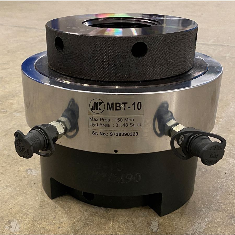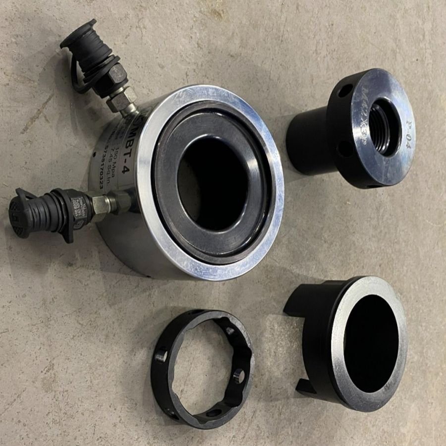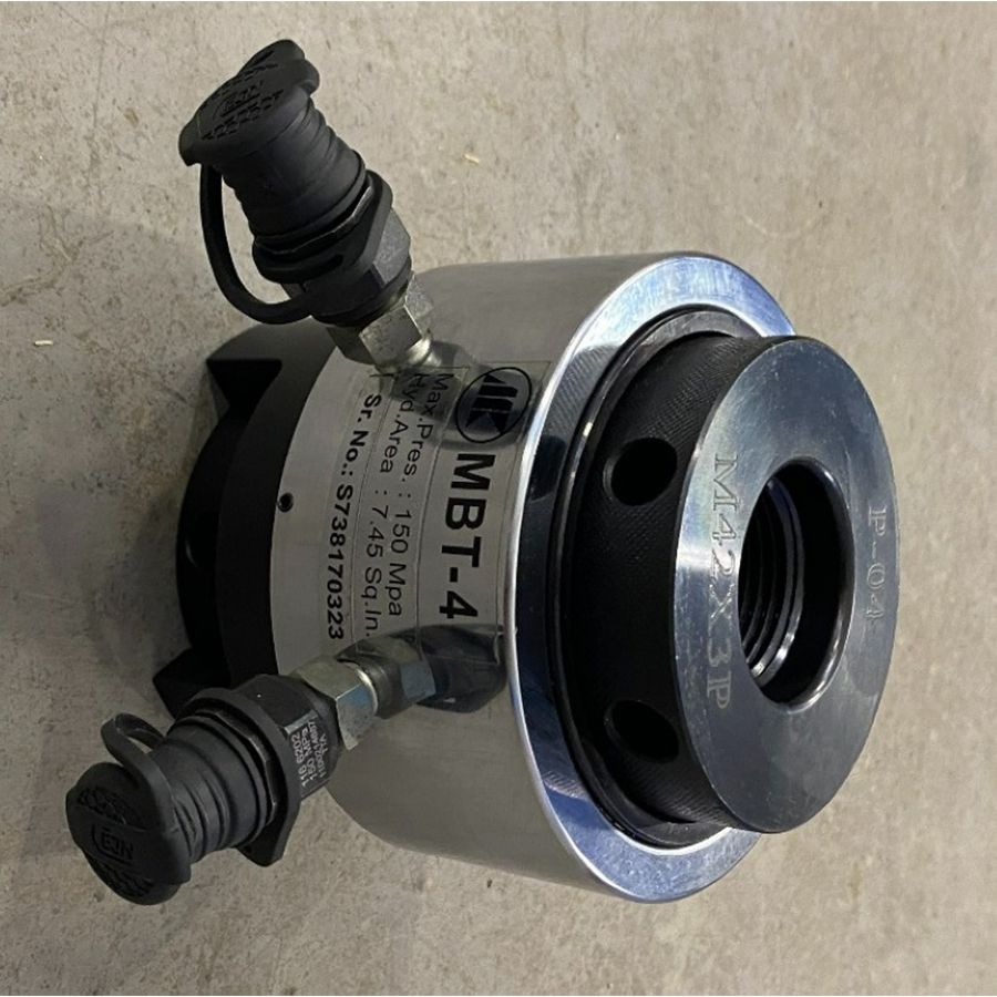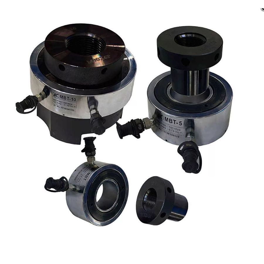 Тензорные домкраты MBT-8 однопоршневые с механическим возвратом - предназначен натяжения резьбовых шпилек при закручивании и откручивании гаек в тяжело нагруженных резьбовых соединениях. После натяжения резьбовой шпильки с заданным усилием, гайка закручивается без приложения усилия до упора. Домкрат снабжен шестеренчатым редуктором с шестигранной кассетой для быстрого и удобного закручивания/откручивания гайки. Домкрат не имеет встроенного насоса. В качестве привода используется ручной или электрический гидравлический насос одностороннего действия с рабочим давлением 1500бар.