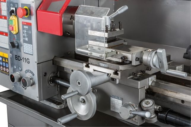 Токарный станок по металлу Jet BD-11G - имеет самый мощный двигатель в линейке настольных токарных станков от JET 1,1 кВт. Двигатель асинхронный, подключается к обычной бытовой сети и имеет потребляемую мощность 1,5 кВт. Благодаря асинхронному двигателю на станке отсутствует потеря момента, а скорости вращения шпинделя изменяются путем перебрасывания ремня на шкивах. Всего скоростей шесть в диапазоне от 150 оборотов в минуту до 2000 об/мин. Расстояние между центрами 700 мм, максимальный диаметр над станиной 280 мм. Станок BD-11G способен выполнять все операции токарного станка. На станке предусмотрена возможность нарезание правой и левой резьбы, автоматическая продольная подача суппорта, возможность поворота резцедержки для проточки малых конусов, юстировка задней бабки для проточки больших конусов. На станке установлена коробка подач, 3-х ступенчатая, которая позволяет изменять шаг резьбы или скорость автоматической подачи без замены шестеренок. Все шестерни, установленные на станке, выполнены из металла. Станок поставляется в комплекте с 3-х кулачковым патроном и неподвижным люнетом. Все остальное можно докупить по мере необходимости – это и 4-х кулачковый патрон, и подвижный люнет, и станцию СОЖ, планшайба, резцы и множество других аксессуаров.