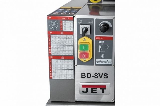Особенностью станка BD-8VS является наличие плавной регулировки скорости в двух диапазонах, диапазоны меняются путем перекидывания ремня на шкивах. Всего диапазона два от 50 до 1250 и от 100 до 2500. Плавная регулировка позволяет подобрать режимы резания под любой тип материала.