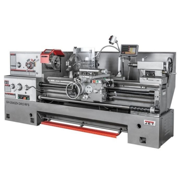 Токарный станок по металлу Jet GH-2040 ZH DRO RFS - предназначен для обточки деталей диаметром до 500 мм над суппортом, до 720 мм со съемным мостиком и до 310 над поперечным суппортом. Расстояние между центрами – 1015 мм, предусмотрено ускоренное перемещение суппорта. На GH-2040 ZH DRO устанавливается мощный асинхронный двигатель на 380 В, скорость вращения шпинделя от 9 до 1600 об/мин, переключение скоростей ступенчатое: всего 24 ступени.