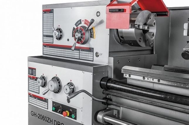 Передняя бабка станка комплектуется электромеханической муфтой, механизм плавного пуска защищает двигатель от пиковых стартовых нагрузок. Привод шпинделя данной модели постоянно находится в масляной ванне, что позволяет решить проблему его смазки, охлаждения и снизить уровень шума. Такой же подход применен и к шестерням передней бабки и коробки подач. На станке можно обрабатывать заготовки на скоростях от 9 до 1600 об/мин, режим 9 об/мин используется для нарезания резьбы плашкой. GH-2060ZH DRO RFS оснащен удобным управлением продольной и поперечной подачей посредством джойстика, предусмотрена возможность ускоренного перемещения суппорта. Для облегчения смены режимов работы предусмотрен толчковый (импульсный) пуск двигателя. Коробка подач станка имеет 80 предустановленных режимов, что позволяет с высокой точностью нарезать метрические, дюймовые, питчевые и модульные резьбы, при этом биение на шпинделе не превышает 9 микрон.