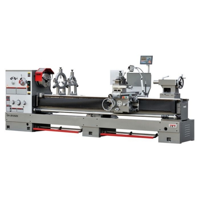 Токарный станок по металлу Jet GH-26120 ZH DRO RFS - самый массивный токарно-винторезный станок в линейке GH-26 производства компании JET. В этой модели расстояние между центрами составляет 3050 мм, что позволяет обтачивать длинномерные заготовки с высокой скоростью и качеством. Диаметр обработки над станиной составляет 660 мм, при снятом мостике gap – 880 мм. Как и положено оборудованию топ-класса, GH-26120 ZH DRO поставляется в богатой комплектации: система подачи СОЖ, УЦИ, два люнета, планшайба, 4-х кулачковый патрон, переходная втулка, вращающийся и не вращающийся центры, опоры для выставки станка, набор инструмента для обслуживания, лампа освещения – все это покупатель получает «из коробки».