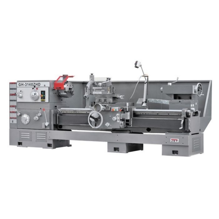Токарный станок по металлу Jet GH-3140 ZHD DRO RFS - это высокоточное оборудование повышенной мощности, которое позволяет обрабатывать детали или заготовки увеличенных размеров в интересах промышленных предприятий различных отраслей, оборонной промышленности, крупных конструкторских бюро и т.п. Эта модель будет интересна тем заказчикам, кто испытывает потребность обточки массивных заготовок диаметром до 800 мм над станиной, до 1000 мм при снятом gap и до 510 мм над поперечным суппортом. Расстояние между центрами у данной модели составляет 1000 мм. Уже с завода GH-3140 ZHD DRO поставляется в максимальной комплектации, покупка ЗИП для пуско-наладочных работ и ввода станка в эксплуатацию не потребуется: система подачи СОЖ, 3-х кулачковый патрон 325 мм с прямыми/обратными кулачками, 4-х кулачковый патрон 500 мм, планшайба 625 мм, 4-х позиционный резцедержатель с фиксатором, галогенная лампа местного освещения, инструментальный ящик со всем необходимым инструментом, люнеты и многое другое - все это уже входит в комплект поставки. На станке установлен мощный асинхронный двигатель мощностью 11 кВт, шпиндель может вращаться на скоростях от 7,5 до 1000 об/мин. Механическая коробка подач позволяет нарезать модульные, дюймовые, питьевые и метрические резьбы. Для быстрой смены режимов работы и безопасного расцепления шестерней у GH-3140 ZHD DRO предусмотрен толчковый или, как иногда его называют, импульсный режим пуска мотора. Для повышения скорости роботы станок имеет механизм быстрого перемещения суппорта, а в целях безопасности предусмотрена педаль тормоза и аварийного отключения. Новинка установлена на фирменную станину JET, отлитую из чугуна особого сорта, она является отличным теплоотводом, а повышенная жесткость конструкции обеспечивает гашение вибраций. Направляющие станины подготавливаются в несколько этапов, включая закалку, шлифовку и обработку антифрикционным материалом.