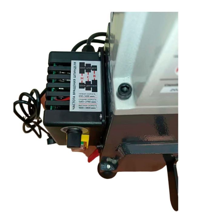 На данном токарном станке установлен коллекторный двигатель (550 Вт) с тремя диапазонами скоростей 650*1450/1250*2800/1600*3800. Для удобства настройки скорости предусмотрен дисплей скорости шпинделя. Переход между скоростными режимами осуществляется без инструментальной перестановкой клинового ремня.