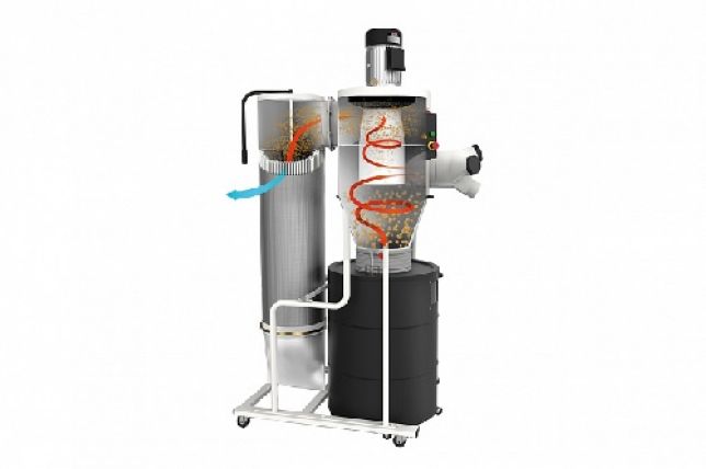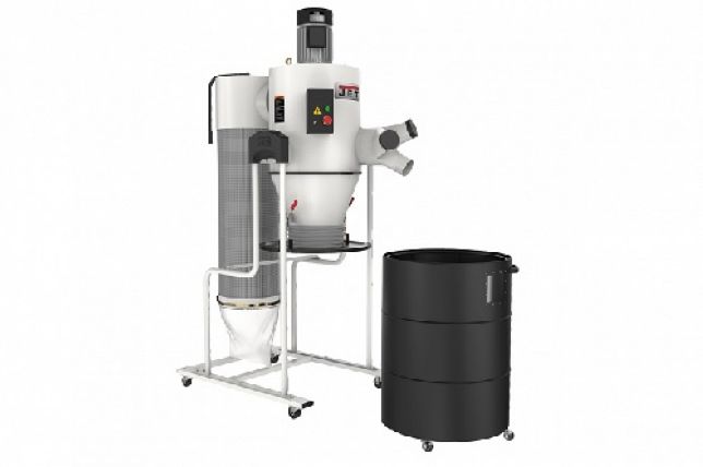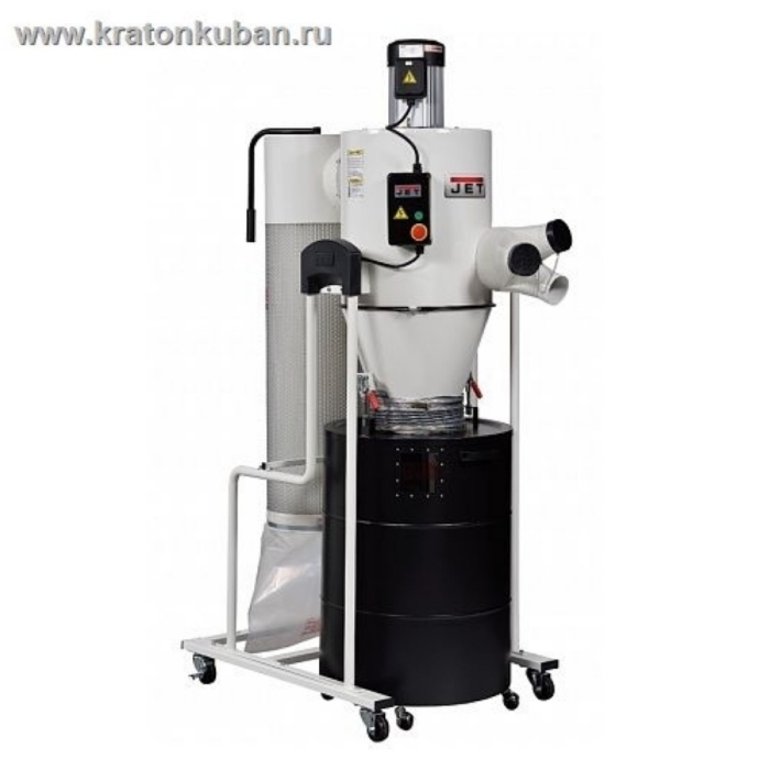 Циклон Jet JCDC-3 - производительная вытяжная установка типа циклон с мощным трехфазным двигателем и высокой степенью очистки отходящего воздуха (2 мкм). Расположенный снизу контейнер для сбора крупной фракции отходов также имеет металлические стенки и герметично закрывается крышкой с двумя прижимными рычагами. Все отходы, за исключением самой мелкой взвеси (древесной муки), попадают именно в этот контейнер, остальное собирается в мешке выходного 2-микронного фильтра. Благодаря большой рабочей поверхности (более 4 кв.м) и высокой степени предварительной центробежной очистки, он мало загрязняется, что дает стабильно-высокую интенсивность всасывания, даже при работе со шлифовальными станками. Учитывая большую ёмкость основного накопителя и простоту его очистки, данную установку можно рекомендовать для любого деревообрабатывающего оборудования, с точки зрения типа удаляемых отходов она универсальна.