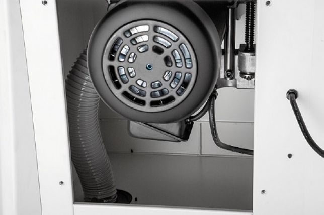 Привод диска от двигателя производится одноступенчатой передачей сравнительно небольшим по длине ремнем. Пильный модуль, сделанный из чугуна, перемещается при регулировке высоты распила вместе с двигателем, как одно целое. Снизу диска на модуле установлен широкий пылесборный кожух, подключенный гибким 100-миллиметровым шлангом к присоединительному патрубку системы аспирации. Такое устройство обеспечивает гораздо лучшее удаление опилок, чем в станках, где отсос производится просто из внутренней полости.