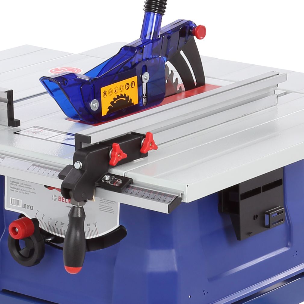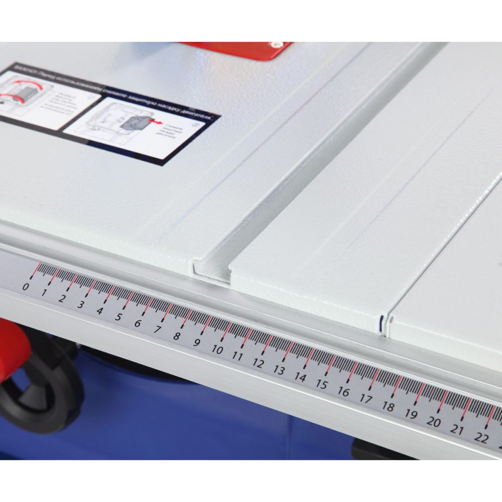 Станок оснащен основным стальным столом, двумя боковыми и одним задним стальными расширениями. Общий размер рабочей поверхности 785?660 мм. Основной стол имеет стандартные Т-образные пазы по обе стороны от режущего инструмента под установку углового упора (-60...+60 град.). Параллельный упор также можно поставить как справа, так и слева от пильного диска. На передней направляющей параллельного упора есть шкалы для точного позиционирования.