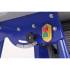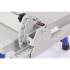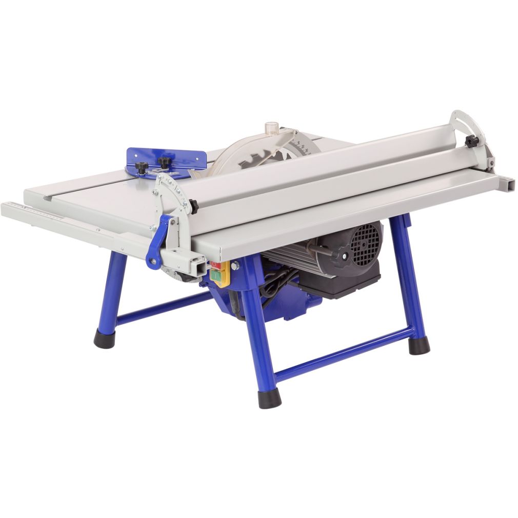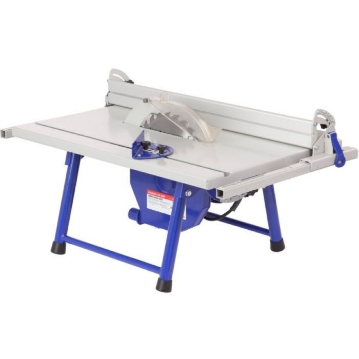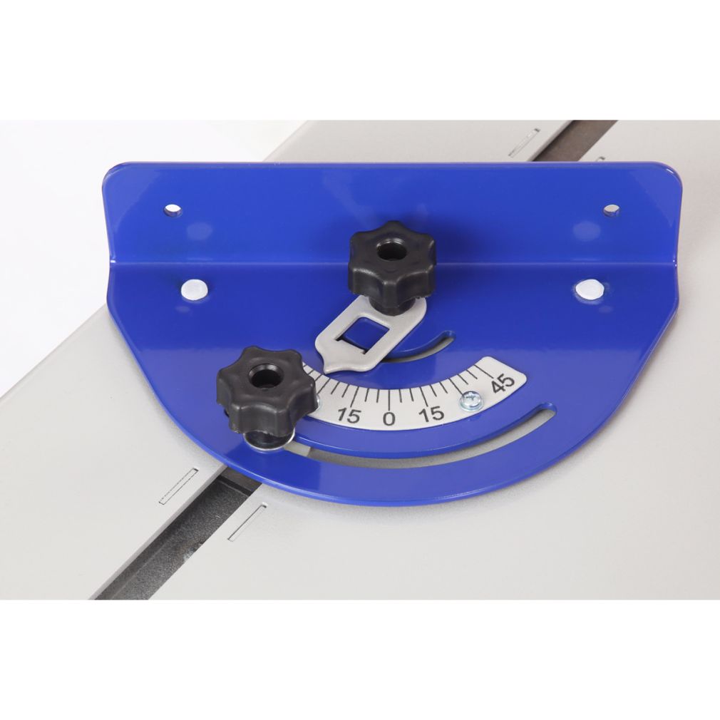- Стальной пильный стол (776*560 мм) и пильный узел установлены на основание. Для ориентации заготовки и обеспечения ее прямолинейного движения станок оснащен упором, параллельная направляющая которого выполнена из алюминиевого профиля с возможностью наклона от 0 до 45 градусов. Упор можно расположить как справа, так и слева от режущего инструмента. Переставляется он легко. Достаточно ослабить рычаг, снять зацеп, перевернуть упор и установить его на направляющие с противоположной стороны.