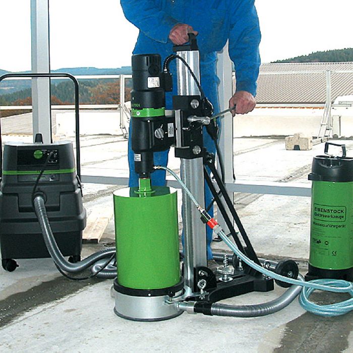 EIBENSTOCK DBE 300 это мощная установка алмазного бурения, оснащённая механическим редуктором который позволяет подобрать оптимальное число оборотов для сверления отверстий до 300 мм. Она без труда справляется со многими твёрдыми материалами, такими как: армированный бетон, природный и искусственный камень, асфальт и т. д.