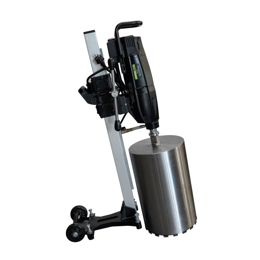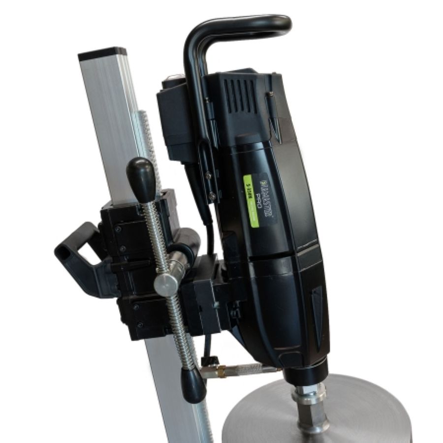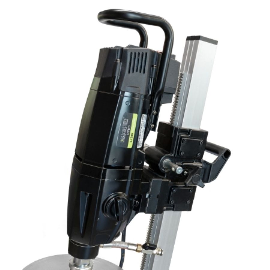 Установка алмазного бурения Diamaster PRO S-350N,прямая стойка D 355N - с плавным пуском применяется для сверления отверстий в бетоне и железобетоне диаметром до 350 мм. Мощность мотора 3,48 кВт. Машина оборудована универсальным хвостовиком, что позволяет ей работать с коронками 1" и 1/4. Установка комплектуется станиной с углом наклона 45°. Цифровой дисплей показывает данные о работе двигателя: напряжение в сети, сила тока, температура, мощность в моменте, состояние угольных щеток, индикация нагрузки и время работы.
