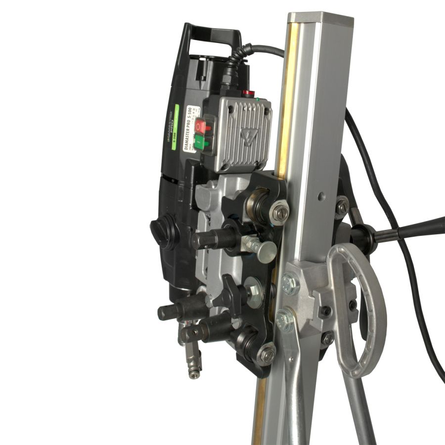 Установка алмазного бурения Diamaster PRO S-500A- стойка D 505/3E-ModulDrill- оснащена системой плавного пуска, что позволяет комфортно работать с коронками диаметром от 25 до 500 мм*. Базовая комплектация машины позволяет сверлить коронки до 320 мм, для работы с диаметром до 500 мм необходима расширительная пластина.