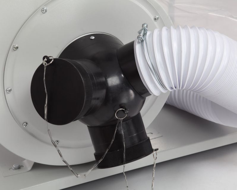 На входной патрубок вытяжки (O150 мм) устанавливается адаптер с тремя входами (O100 мм). Одновременно можно подключить три точки удаления отходов резания. Не нужные патрубки можно закрыть крышкой.
