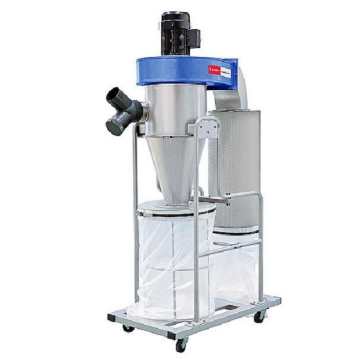 Сначала воздух с большой скоростью тангенциально подается внутрь цилиндрической части корпуса циклона. Под воздействием центробежной силы крупные частицы отбрасываются к стенкам, а затем вниз – в коническую часть аппарата. Оттуда отходы попадают в большой стружкосборник. Это первая ступень очистки. Затем воздух поступает в фильтр-картридж, где за счет прохождения потока через фильтрующий элемент с большой площадью поверхности (3,5 кв. м) происходит окончательная очистка. Мелкие частицы собираются в малом мешке, который крепиться под фильтром. Это вторая ступень очистки.