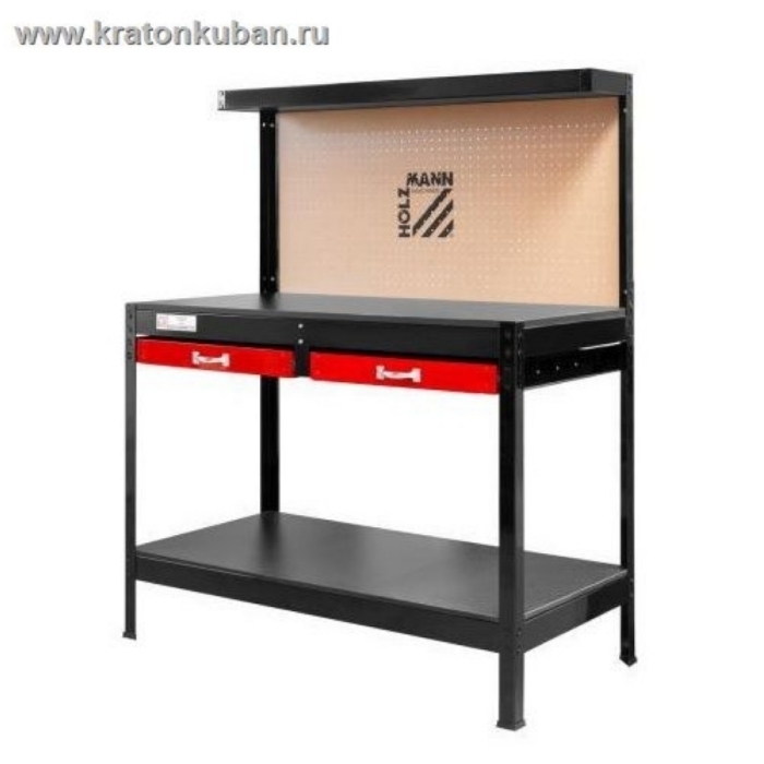 Верстак Holzmann WT06 оснащен столешницей из МДФ большого размера, которая размещена на прочном основании из листового металла. Столешница выдержит максимальную нагрузку 100 кг.