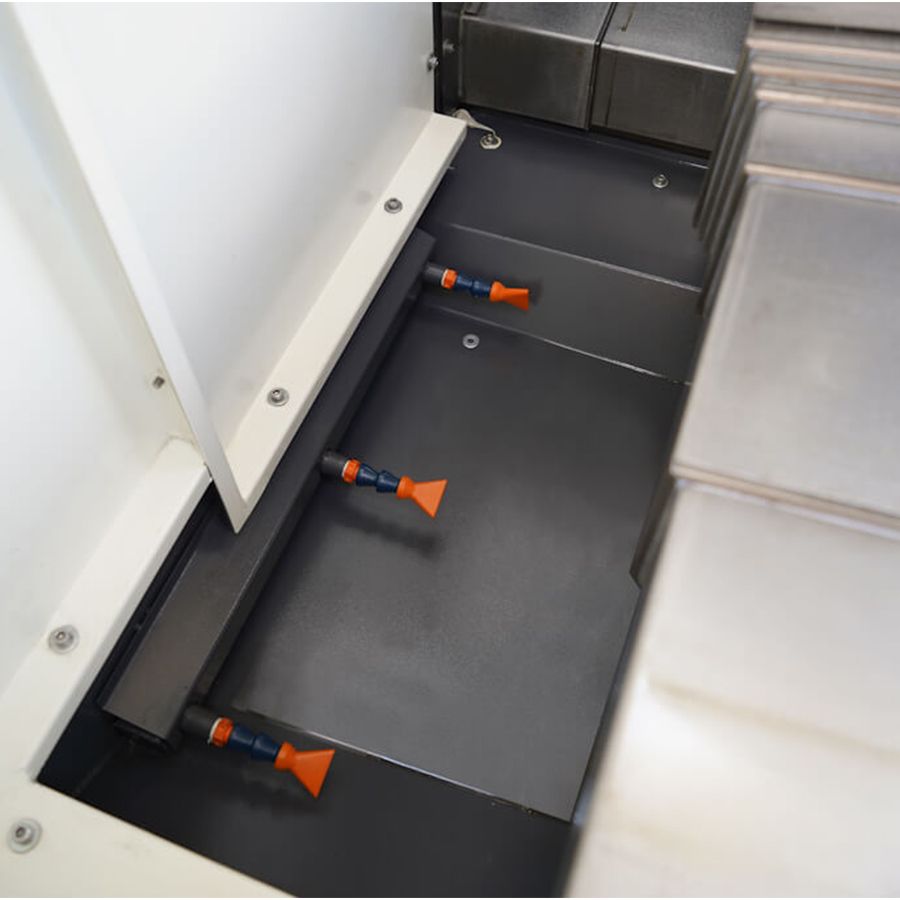 Дополнительные патрубки СОЖ установлены внизу рабочего стола для удаления скопившейся стружки.