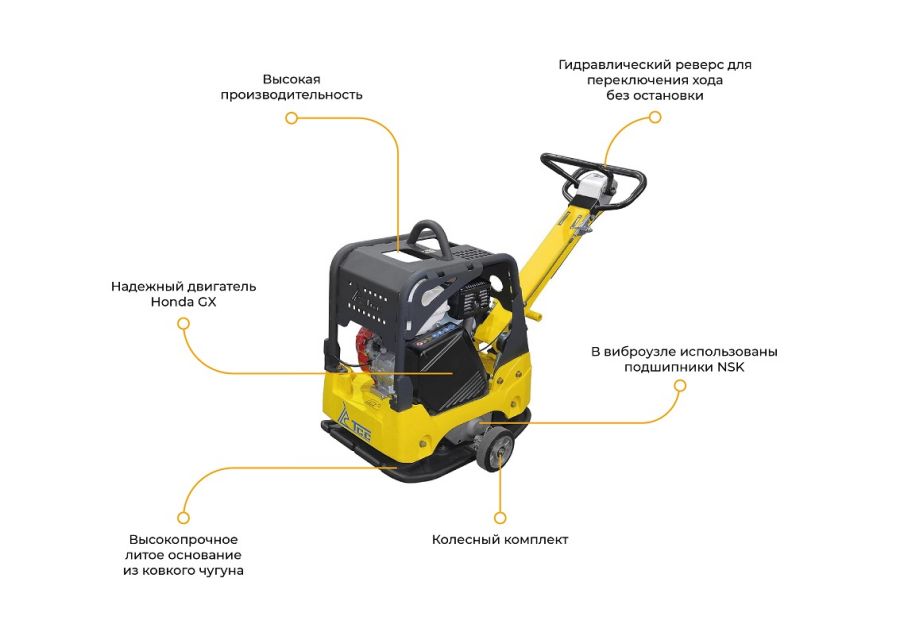 - Гидравлический реверсивный механизм позволяет виброплите маневренно двигаться вперед и назад, а также работать на одном месте уплотнения;