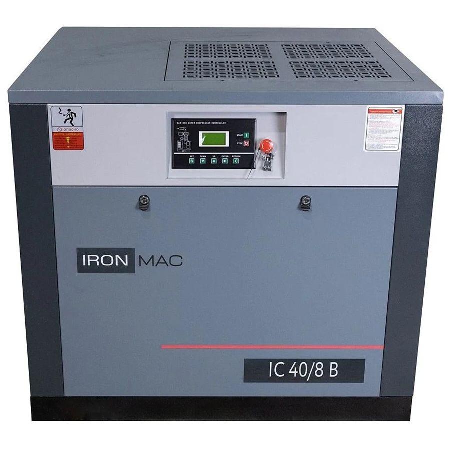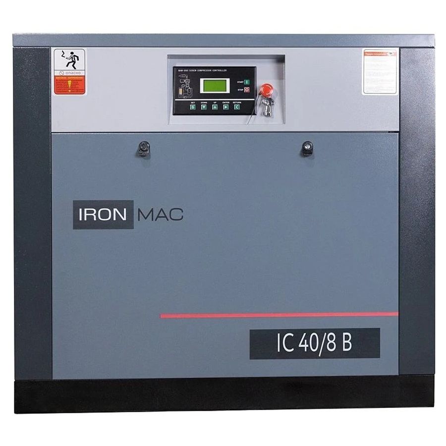 Винтовой компрессор IronMac IC 40/10 B (IP 55) 30 кВт, 5 м3/мин - обладает высокой производительностью 5000 л/мин и мощностью 30 кВт подает сжатый воздух к пневмоинструменту под давлением 10 бар.