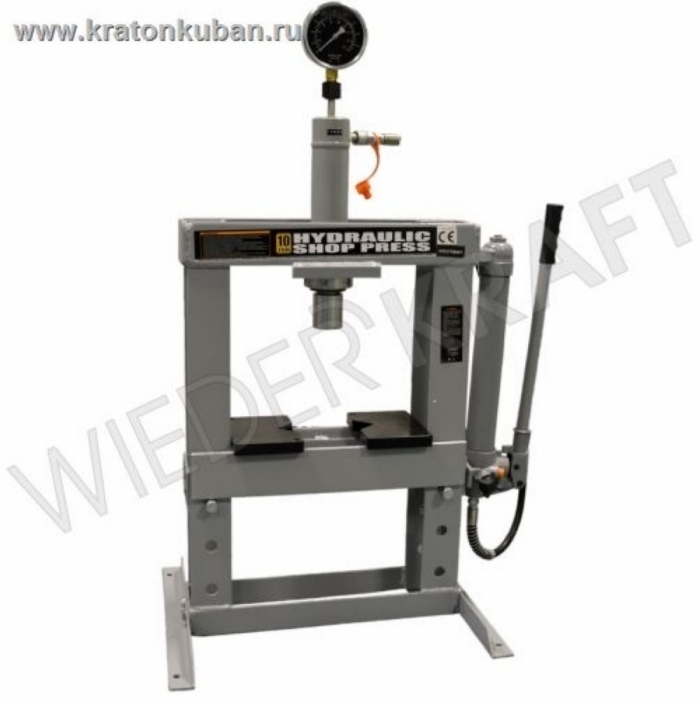 Пресс настольный гидравлический 10 тонн, WiederKraft WDK-80310 - разборная рамная конструкция из стоек, станин, верхней и нижней балок и привода, состоящего из гидравлического цилиндра. Детали подвергаемые прессовке могут иметь различные размеры, ограниченные по высоте и ширине размерами рабочего пространства пресса